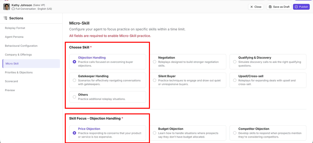 Full call simulations last 20 to 30 minutes, happen infrequently, and test too many skills at once for any single one to improve. Micro-learning roleplay flips that model. A rep spends five minutes handling a pricing objection or practicing a specific discovery question under pressure. The next day, they drill a different scenario. Over a week, they accumulate practice across five or six discrete skills without sitting through a marathon simulation.