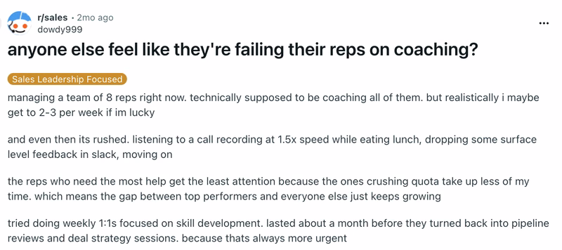 Manager reinforcement rarely happens. Frontline managers are the single most important lever for behavior change after training, yet most like in the below reddit post are stretched across pipeline reviews, forecasting, hiring, and their own quota pressure.