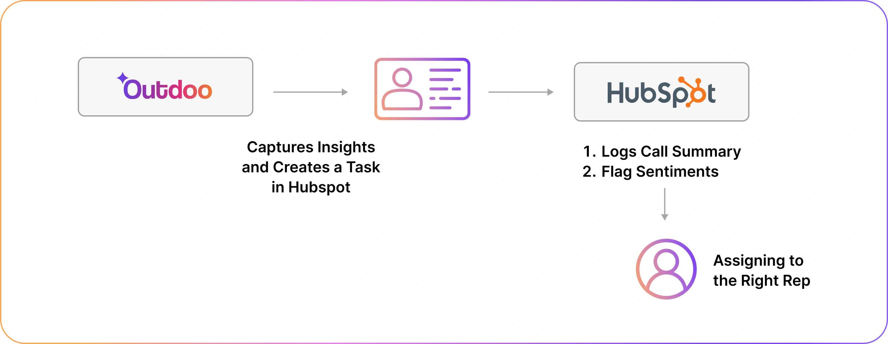 | Call-to-action logging | Trigger tasks from conversation insights | Outdoo (formerly MeetRecord) + HubSpot | Better follow-through, less rep effort, improved manager visibility |