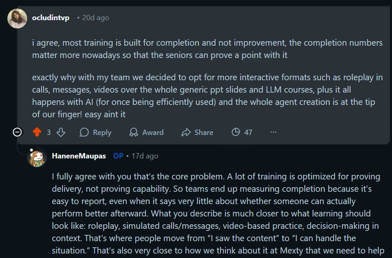 In practice, the pattern looks like this: teams that invest heavily in onboarding and certification report high completion rates, but frontline managers still spend disproportionate time coaching the same skill gaps. New hires who "passed" certification freeze on their first live call. Tenured reps who aced a refresher course continue making the same errors in deal negotiations. The certification data says the team is trained. Every other signal says otherwise.