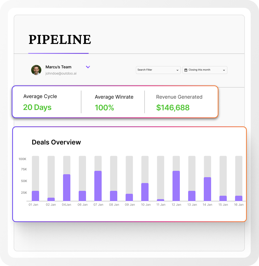 Spot deal risks early, understand buyer signals, and coach your teams to win faster. Outdoo drives predictable, scalable growth with AI-powered insights and automation.