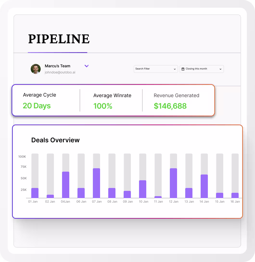 Outdoo supports MEDDICC, SPICED, BANT, or custom frameworks to ensure consistent execution across SaaS GTM teams.
