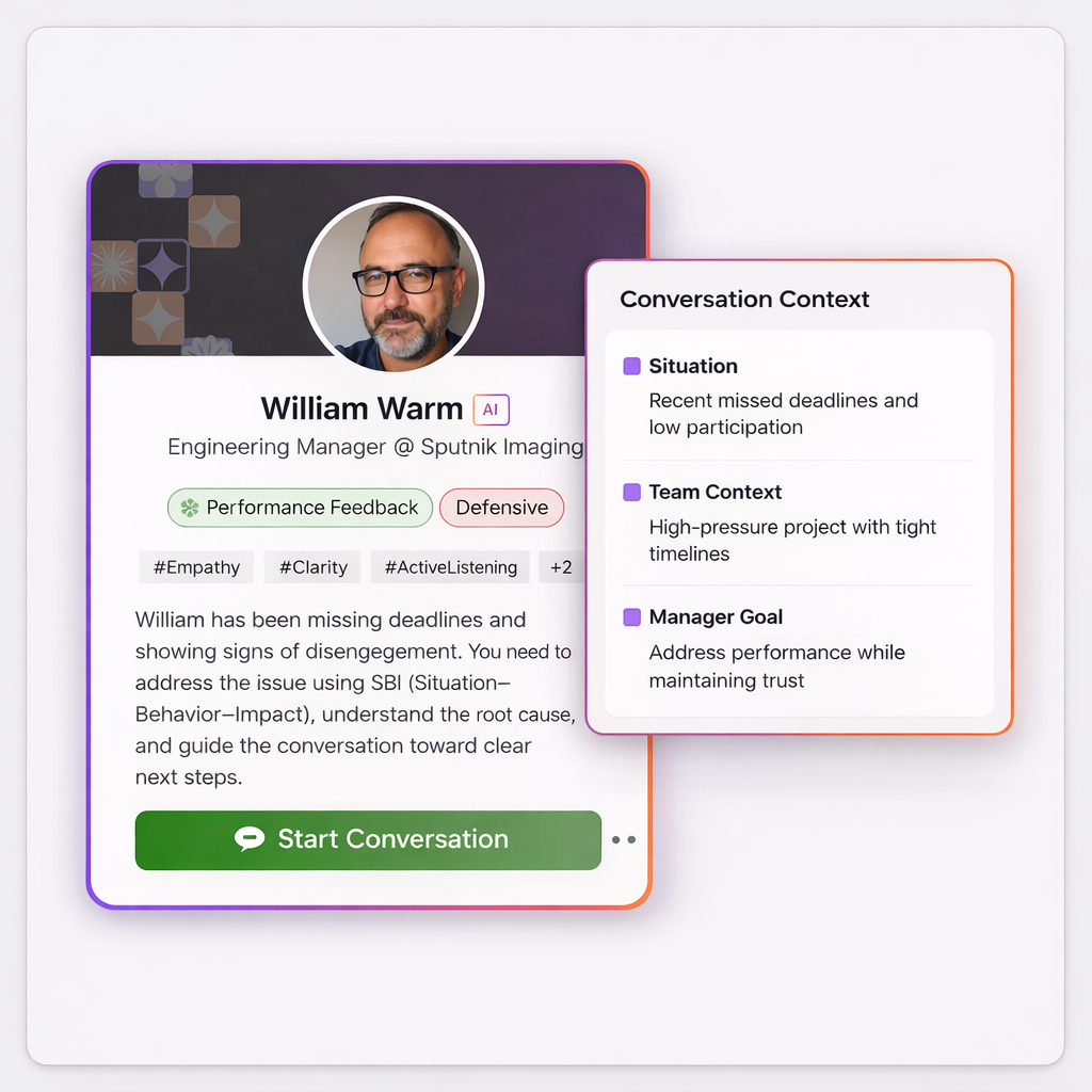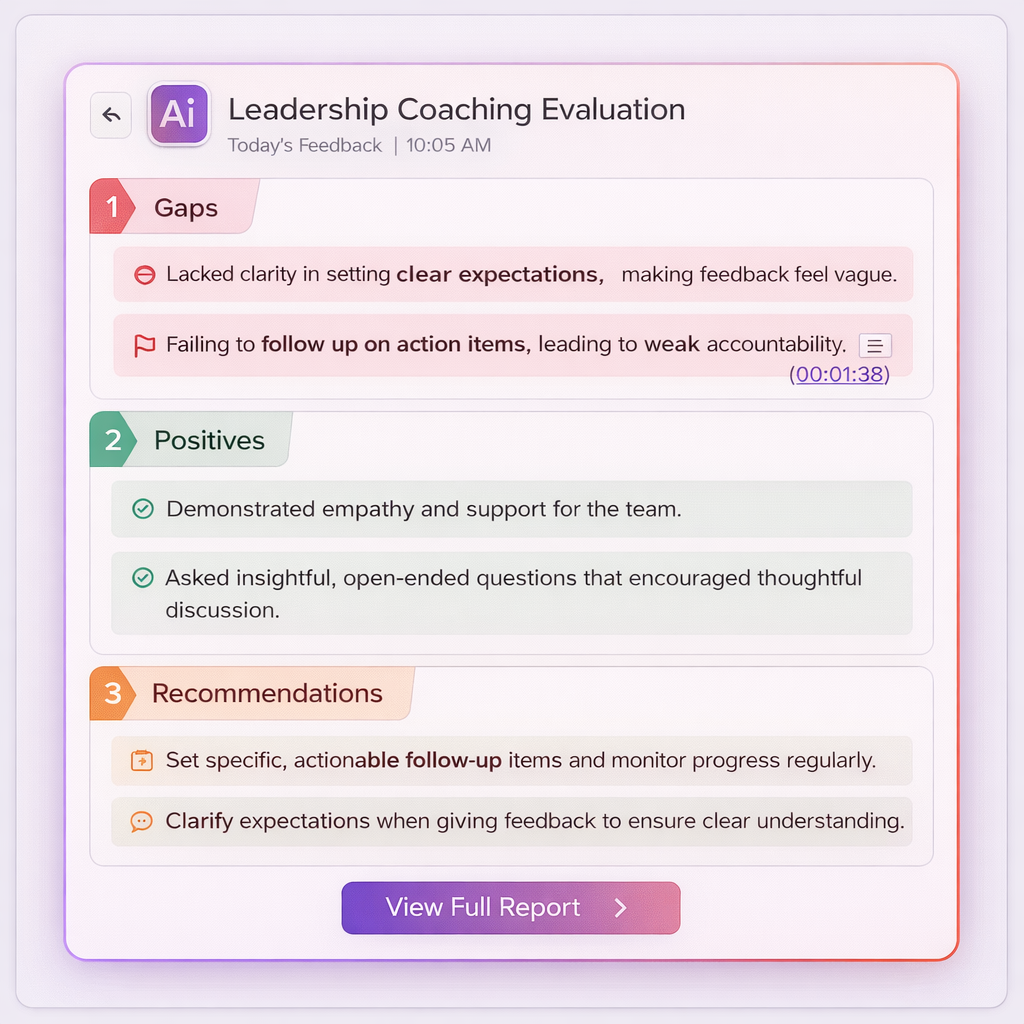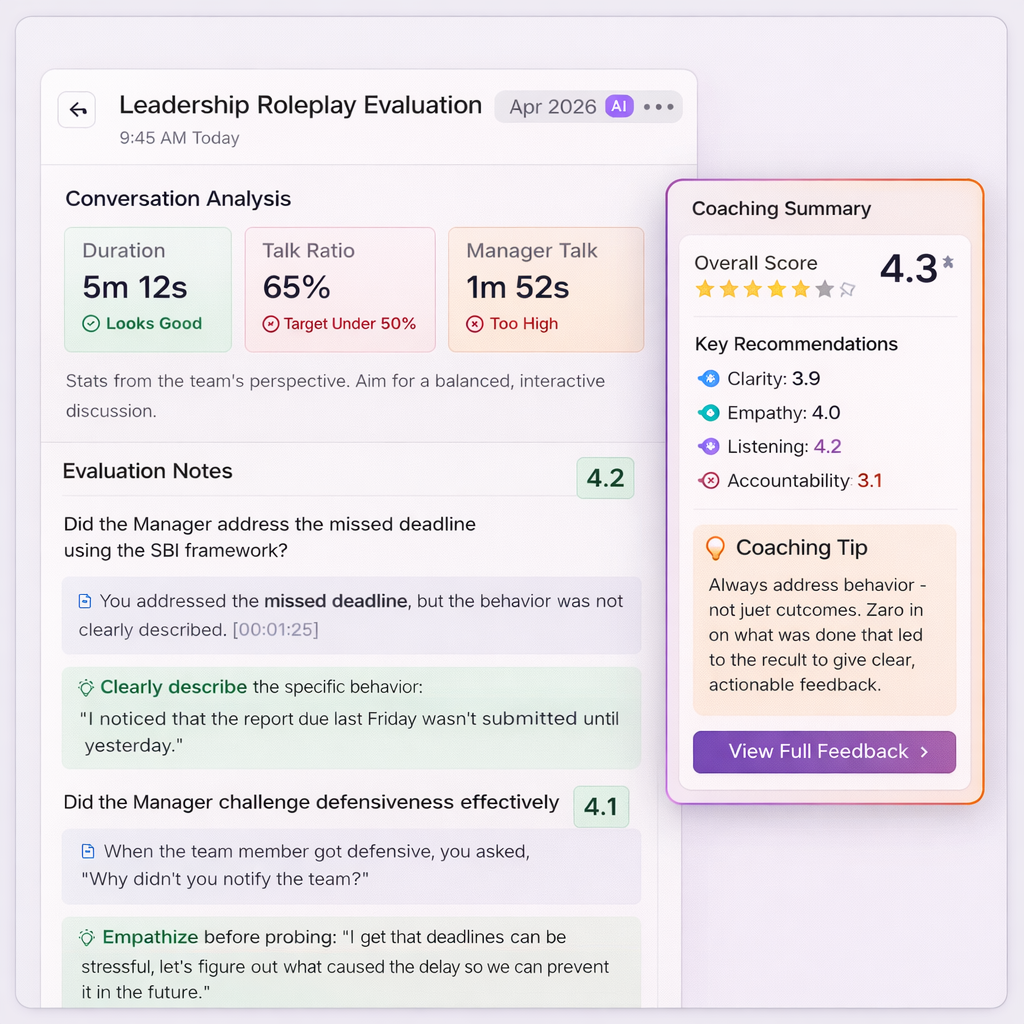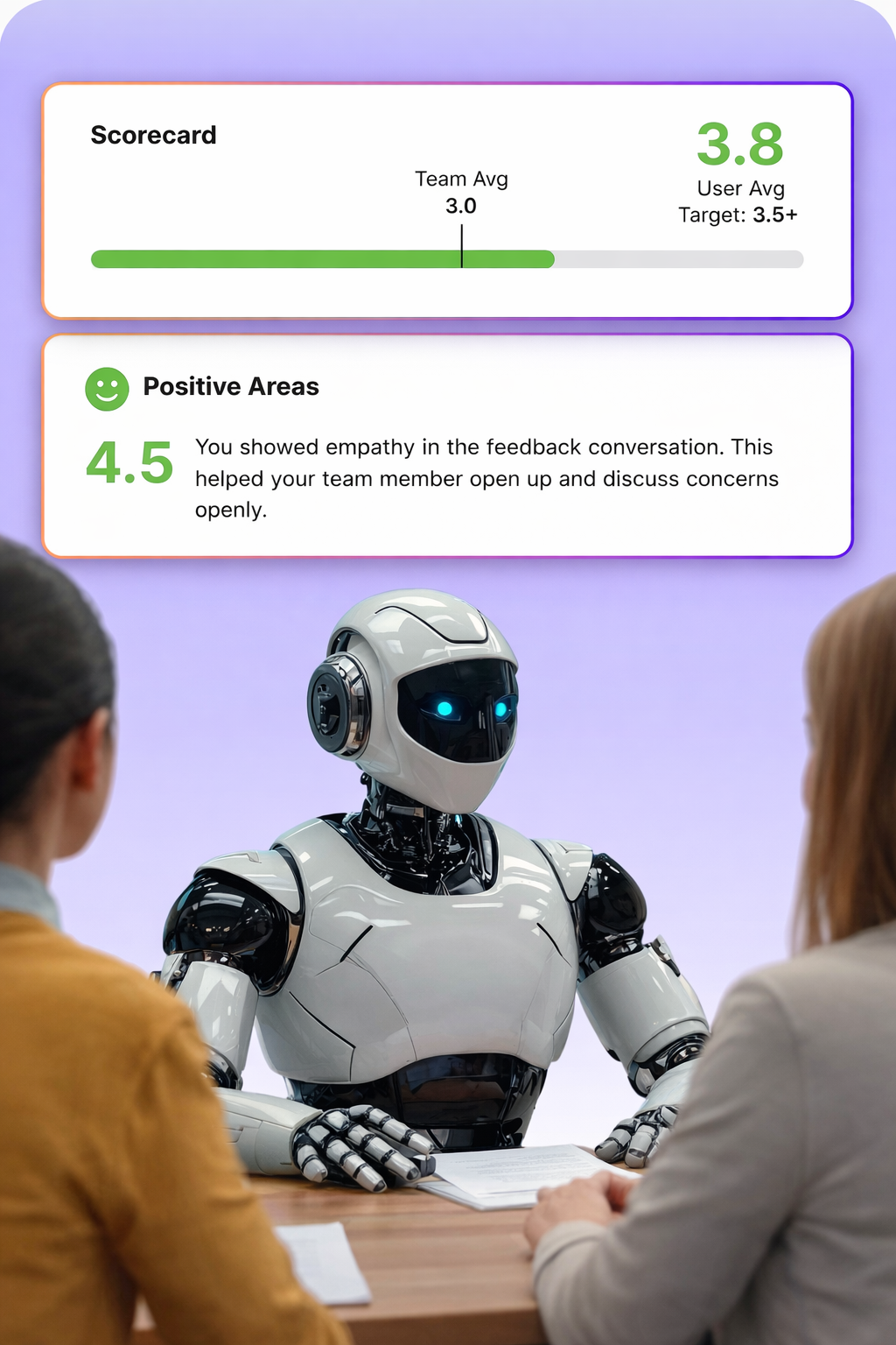 Traditional coaching is limited by time and depends on individual managers or external coaches. AI leadership coaching enables continuous practice through realistic scenarios, with instant, objective feedback on how leaders communicate, coach, and handle situations.
