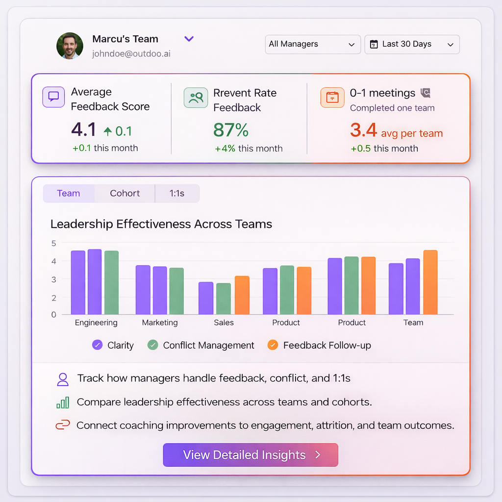 Outdoo turns leadership coaching into a repeatable system. Leaders practice real conversations, receive structured feedback, and organizations gain visibility into how leadership quality improves across teams.